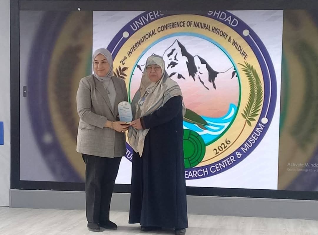 من ضـمن فعــاليات المـؤتـمر الـدولي الثـانـي للتـاريخ الطبـيـعي والحـياة الـبرية لعــام 2026، والــذي شهد مشاركـة واسعة من الباحثين والأكاديميين المحليين والدوليين، تم تكريم مديرة قسم الدراسات والتخطيط/رئاسة جامعة بغداد (أ.د. منال شاكر علي) ، وذلك من قبل السيدة مديرة مركز بحوث ومتحف التاريخ الطبيعي/جامعة بغداد (أ.م.د هناء الصفار)، وذلك تقديرًا لجهودها العلمية وإسهاماتها المتميزة في إنجاح فعاليات المؤتمر.